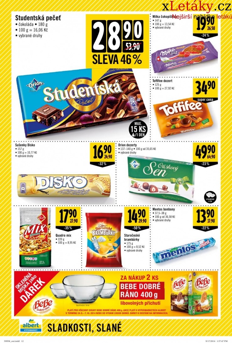 Prohlédněte si leták Albert Hypermarket veľký leták s platností 24.09.-30.09.2014. Na online-letaky.cz naleznete všechny letáky Albert Hypermarket